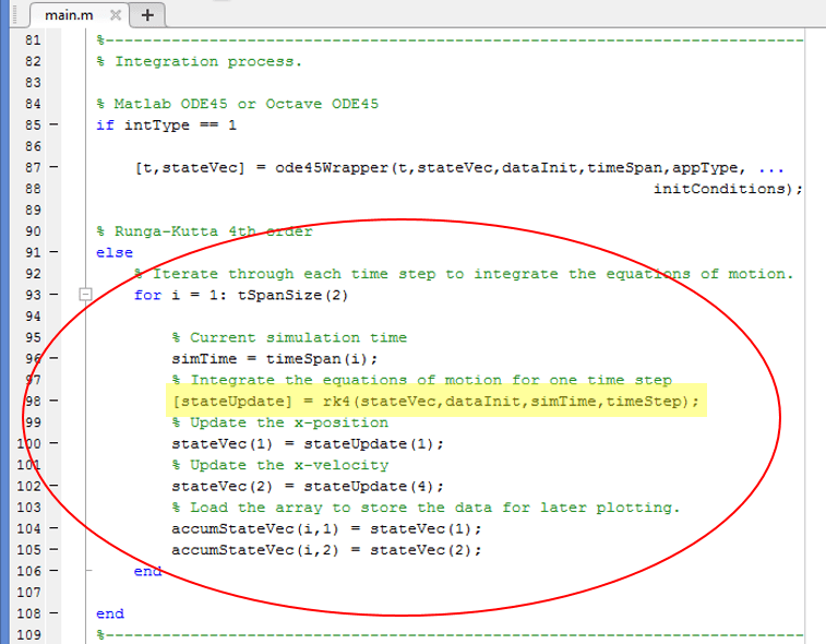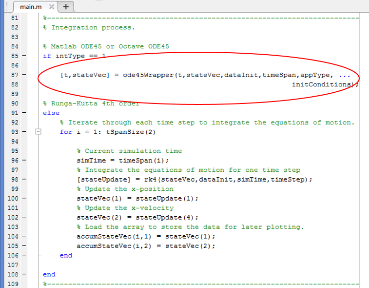 The other integrator is the Runge-Kutta 4th order integrator (also very common and popular) – in this case the trajectory is propagated one time-step at a time. As shown in the code example below, the integrator is called for each time step in the simulation and thus the solution is propagated forward with each call to the function. This is not a Matlab or Octave native function and thus has to be hand-coded (or the basic algorithm copied from another source and converted into Matlab’s scripting format).