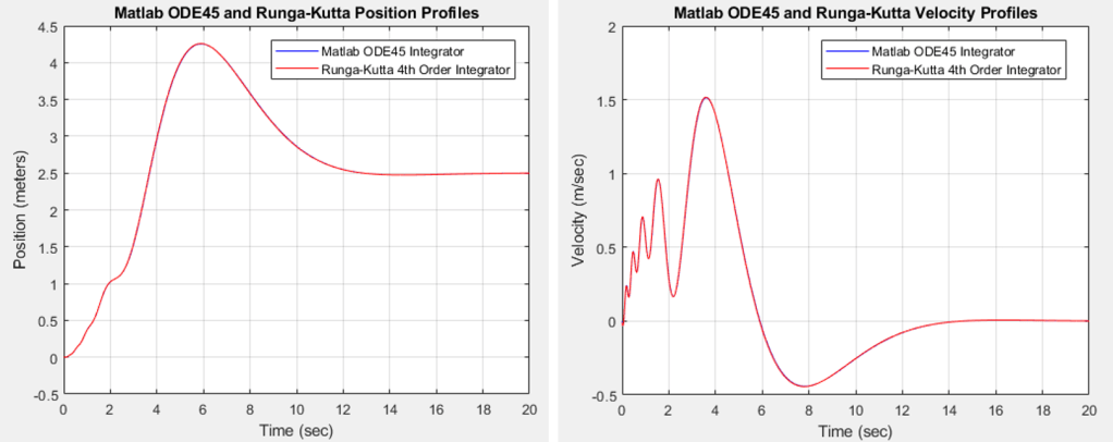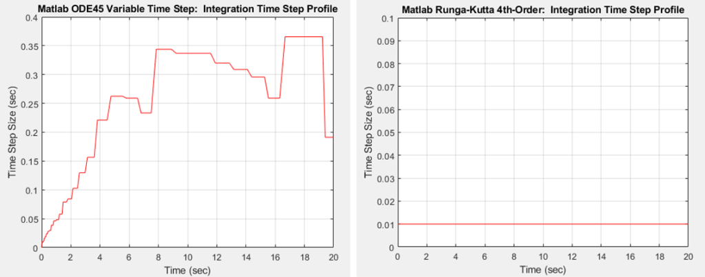 Identical results can be obtained when using either integrator as shown below. In this case, the Matlab ODE45 integrator was run with a variable time step, while the Runge-Kutta integrator was run with a very small fixed time step of 0.01 seconds.