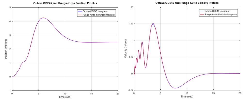 As with Matlab, identical results can be obtained when using either integrator as shown below. In this case, the Octave ODE45 integrator was run with a variable time step, while the Runge-Kutta integrator was run with a very small fixed time step.