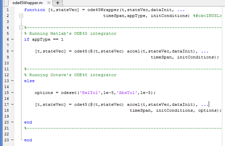 One change had to be made to the ODE45 integrator implementation – that is that the tolerances had to be lowered because it appears that the default values are too high for the example test case (the high frequency of the forcing function requires tighter tolerances in the variable time step algorithm). Thus an ODE45Wrapper function was made to contain the ODE45 function calls for both Matlab and Octave. The difference is that the tolerances are specified prior to the ODE45 call, in Octave, as shown below.