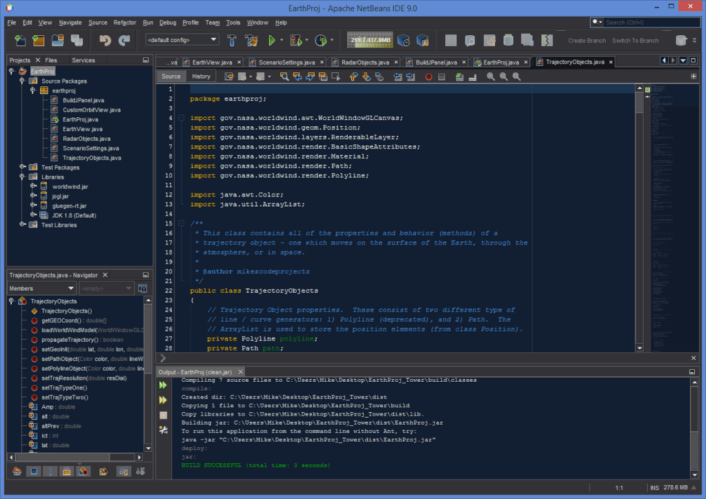 This project was put together with: 1) Java Development Kit (JDK) 1.8, and 2) NetBeans 8.1 IDE, running on a Windows 8.1 Operating System (OS). Keep in mind that this code (the Java source code, the WorldWind and JOG jar files and DLL files) could easily be assembled quickly into an IDE such as Intellij IDEA or Eclipse. This could also easily be run in Linux – the main differences are that in Windows, Dynamic Link Libraries – called DLLs, are used, whereas in Linux the equivalent would be Shared Objects – called SOs. Thus you’d need to get the JOG .SO files for Linux (I actually have them if you need them – just email me).