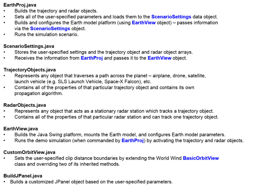 Thus there are two main elements to consider: 1) the Earth model and simulation engine, and 2) the user-designed objects that will be used as part of the Earth model and simulation. In this case, the model objects are trajectory objects (that traverse across the globe) and radar objects (stationary on the globe and track the trajectory objects).