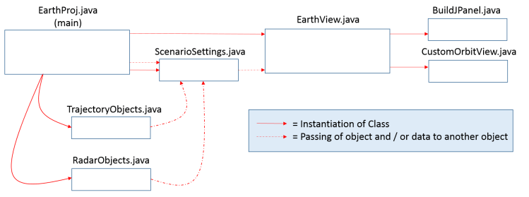 At a high level think of it like a physical game with game board and pieces. The Earth model is the game board and the model objects are equivalent to the game pieces that you place on the board. So when you first start out, you have to remove the game board from the box and lay it on the table – in the same way you launch the Earth model and prepare it for the model objects. Then you select the game pieces on the board – in the same way you build / select model objects and put them into the Earth model. That’s it. As a side note, no explicit design pattern was used for this project.