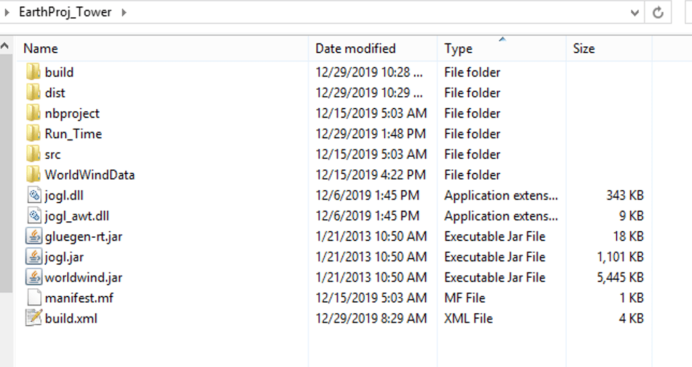 Move the (cut and paste) the WorldWindData directory into the EarthProj_Tower directory on your desktop – the directory should look like this when you’re done:
