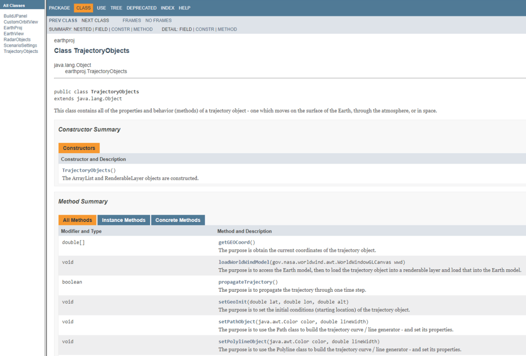 There are two classes of models: 1) the TrajectoryObjects class, and 2) the RadarObjects class. The TrajectoryObjects class contains the properties and propagation algorithms for objects that move at or above the surface of the Earth model. The RadarObjects class contains the properties for stationary objects on the surface of the Earth model that track the moving objects.