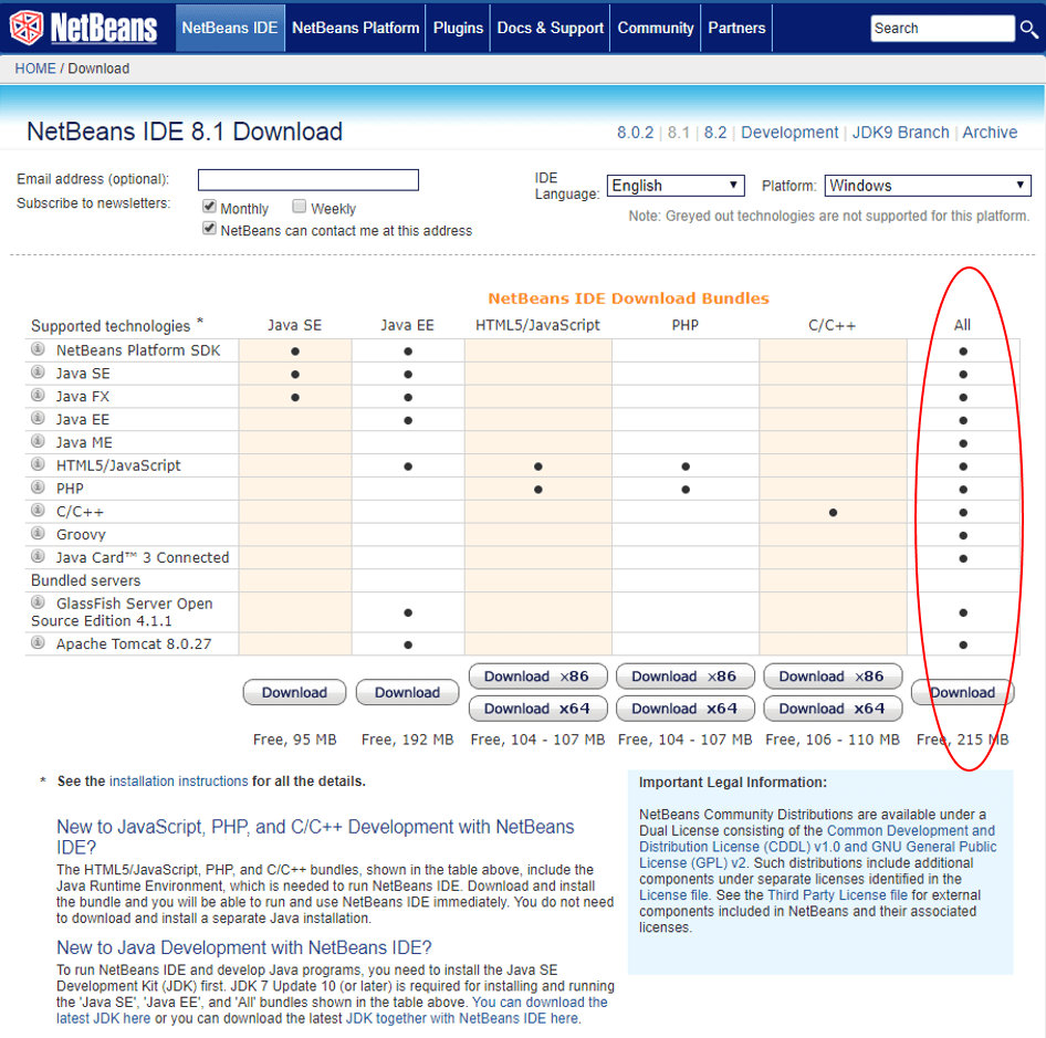 The download link for NetBeans 8.1 is https://netbeans.org/downloads/8.1. I would suggest that you download the largest and most feature-filled package (circled below on the right). Note that if you don’t have a JDK installed, NetBeans will not continue its installation – so make sure that you install the JDK first.