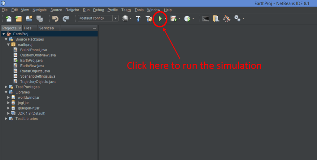5) Start NetBeans 8.1 and navigate to open the “EarthProj_Tower” project on your desktop – allow the IDE to scan the project files and then click the green triangle (as shown below) and the simulation will begin.