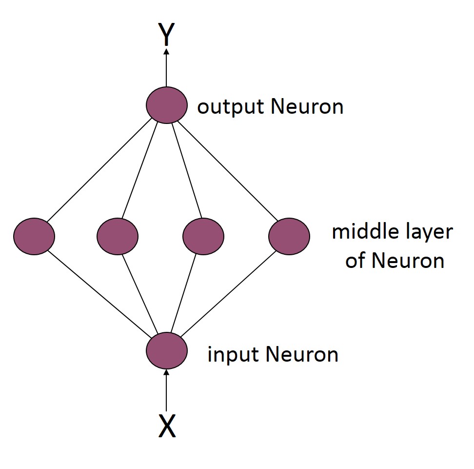 In this first test case, a simple Neural Network architecture is used – one “middle” layer with four Neurons – as shown below.