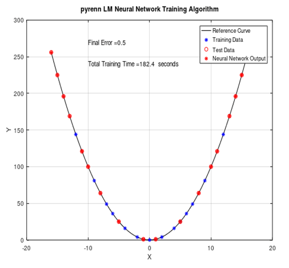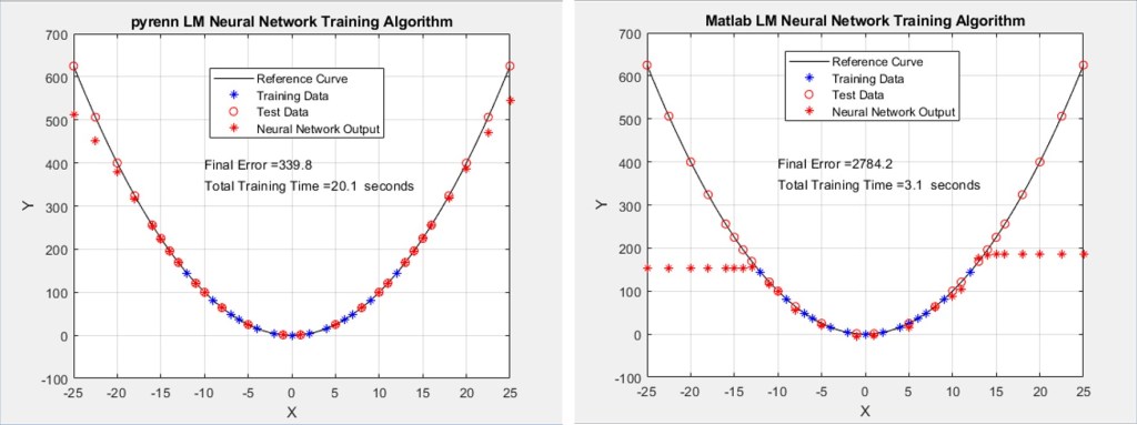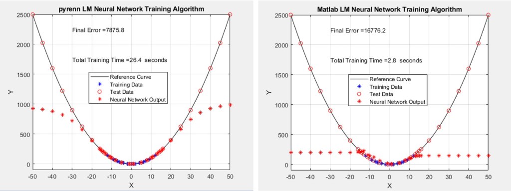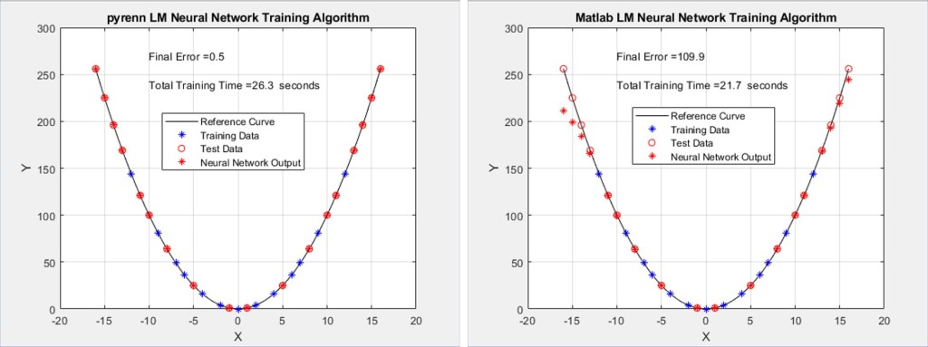 This article discusses the results of testing both the Pyrenn LM and Matlab LM training algorithms on a simple quadratic curve. The summary results are shown below. The section following that is a technical appendix which discusses the details of all of the testing. At the very end of this article are three videos: 1) using the code in Matlab, 2) using the code in Octave, and 3) an informal code “walk-through”. Following the videos is a link to a downloadable zip file which contains all of my source code (and the Pyreen source code) used for the analysis in this article so that you can run it yourself – either in Matlab or in Octave.