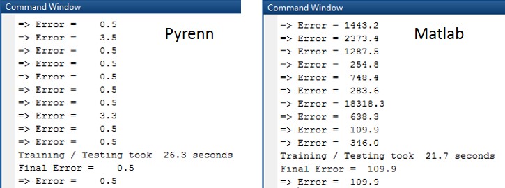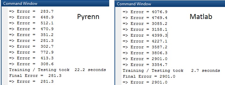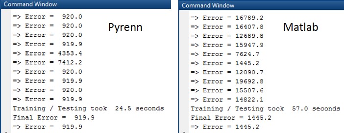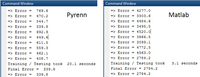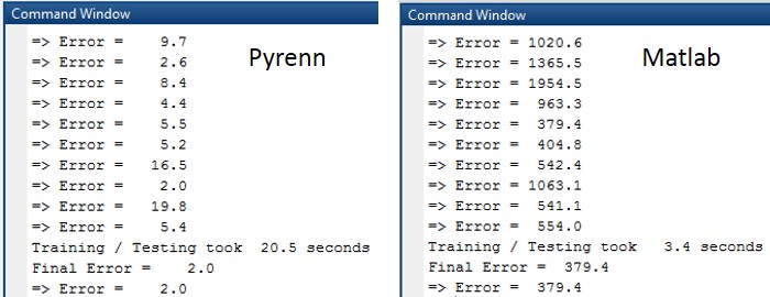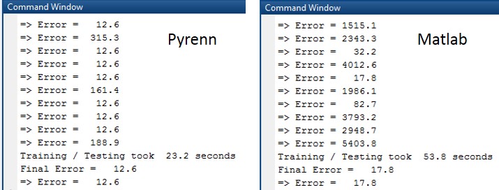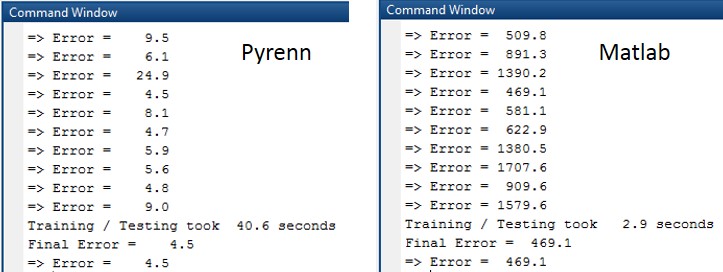 The Command Window output for each of the training / test sessions is shown below. Note that the difference in the test errors is an order of magnitude.