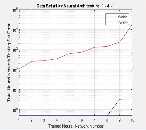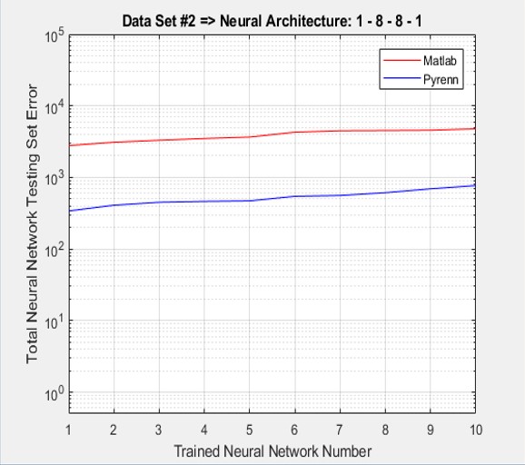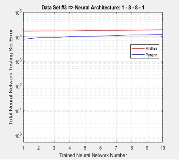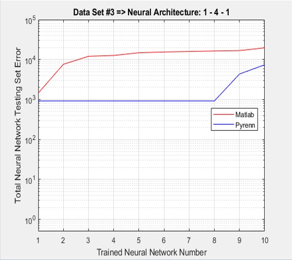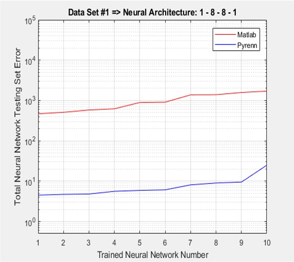 While the performance of a particular Matlab LM-trained Neural Network was good, the accumulated test errors were far less for the Pyrenn LM-trained Neural Networks than those trained by the Matlab LM algorithm (because the majority of the Matlab LM-trained Neural Networks did poorly). Note that the errors were sorted from lowest to highest. One way to interpret the plot is that the Pyrenn LM algorithm generated a lot more high-performing Neural Networks than the Matlab LM algorithm.