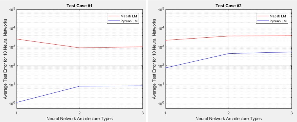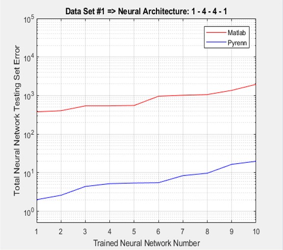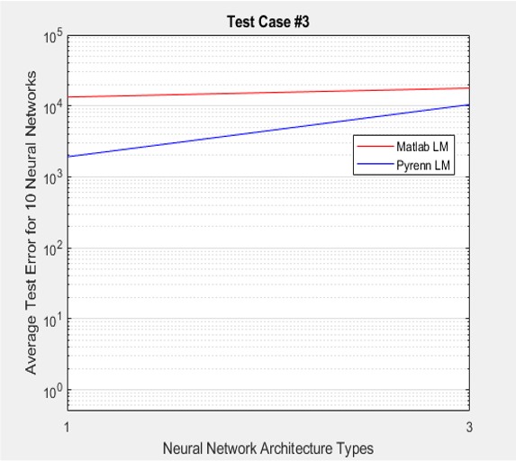 In each of the test scenarios, the Matlab LM algorithm was used to train 10 Neural Networks – the best one, with the lowest test error, was selected to compete against the Pyrenn LM algorithm. In a similar manner, the Pyrenn LM algorithm was used to train 10 Neural Networks, and again, the best one was selected as the competitor.