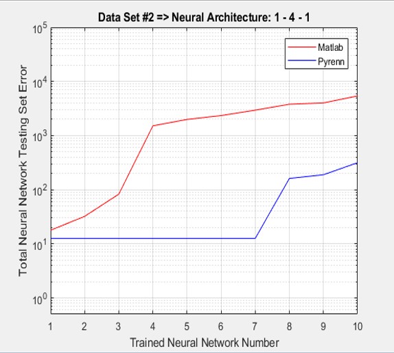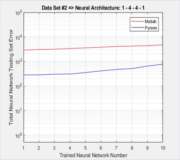 As shown below, the accumulated test errors were far less for the Pyrenn LM-trained Neural Networks than those trained by the Matlab LM algorithm. Note that the errors were sorted from lowest to highest error.