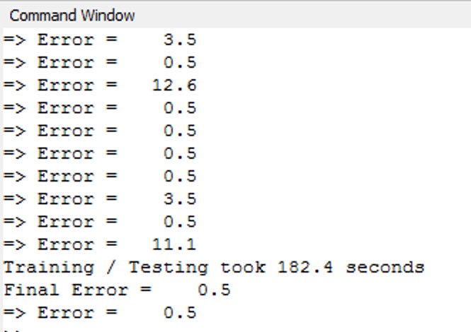 The Command Window output for each of the training / test sessions is shown below. Note that the difference in the test errors are an order of magnitude.