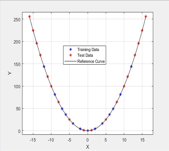 The actual quadratic curve used for this article is shown below. The blue stars represent the Neural Network training points – the corresponding X and Y coordinates for each point are the input and output training data sets respectively. The red stars represent the test points – note that the test set lies both inside the training area as well as outside of it. This is actually used as Test Case #1 – the farthest “outside” test point reaches approximately 33% beyond the training regime.