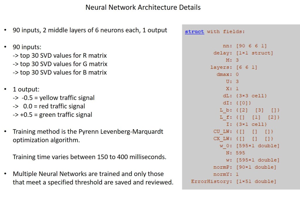 This article discusses a simple case of using a Neural Network to interpret an image, which contains a traffic light system, with the objective being to correctly identify if the light is red, yellow, or green. Here is a video link which goes over the basic running of the software. If you send a donation to my PayPalMe along with your email address and I’ll send you a copy of the codebase, which runs in Matlab or Octave.